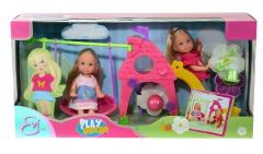 Dwie laleczki Evi z placem zabaw - huśtawką, zjeżdżalnią, makietą domku, z akcesoriami do zabawy.