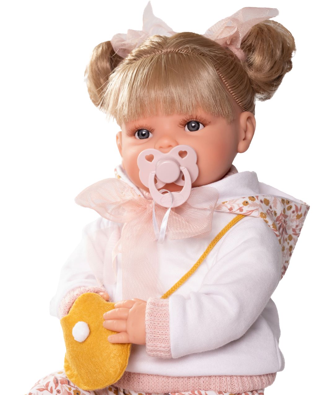Lalka hiszpańska płacząca Beni z torebką 42 cm Antonio Juan 16384 Jeśli mała wielbicielka wyjątkowych zabawek marzy o hiszpańskiej lali przyjaciółce, idealnej do przytulania, przebierania i czesania, blondynka o imieniu Beni z pewnością wzbudzi zachwyt. Model 16384 z miękkim brzuszkiem, od renomowanego producenta Antonio Juan ma 42 cm wysokości i przypomina małą dziewczynkę. Po wyjęciu smoczka płacze i mówi: mama, papa. Stale otwarte, brązowe oczy o głębokim spojrzeniu opatrzone są długimi rzęsami i delikatnie namalowanymi brwiami. Lalka hiszpańska Antonio Juan Beni 16384 w modnym stroju Wykonana z wysokiej jakości, przyjemnego w dotyku winylu lalka hiszpańska Antonio Juan 16384 posiada materiałowy brzuszek wypełniony miękką wyściółką. Beni ubrana jest w oryginalny, szyty ręcznie strój, który można zdjąć: jasny ciepła bluza z kapturem i tiulową kokardą ładnie prezentuje się w komplecie z bawełnianymi długimi spodenkami w roślinny wzór, zestaw uzupełnia specjalny smoczek magnetyczny na tasiemce oraz mała żółta torebka dla lalki. Atonio Juan Beni to unikalna lalka hiszpańska na prezent Lalka Beni 42 cm posiada wszystkie wymagane certyfikaty bezpieczeństwa. Jest przeznaczona dla dzieci od 3 roku życia. Wyprodukowana została w całości w Hiszpanii. Zapakowana w biało-różowe, ozdobne pudełko z wieczkiem, świetnie sprawdzi się jako oryginalny prezent dla wielbicielki wyjątkowych zabawek.