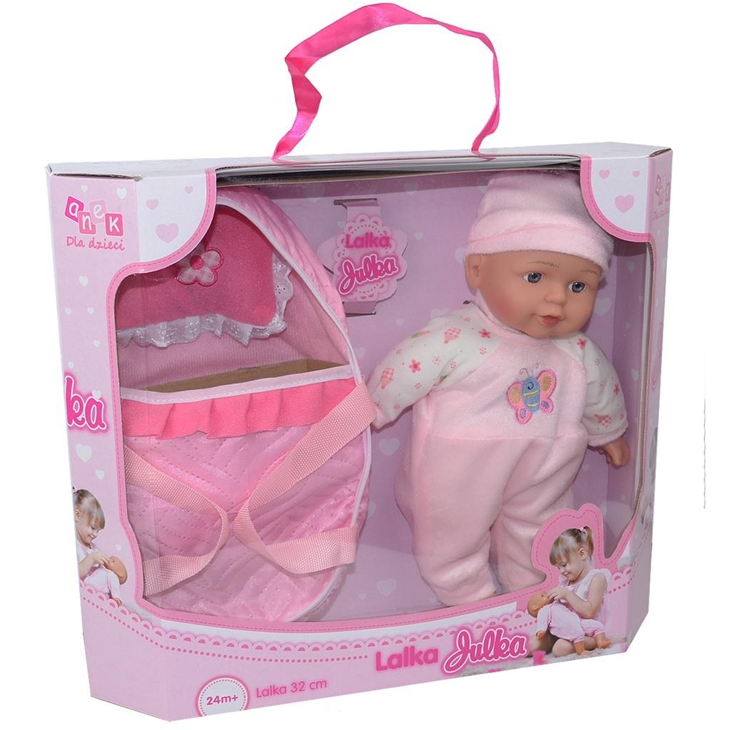 Lalka Julka o wysokości 32 cm w zestawie z nosidełkiem.