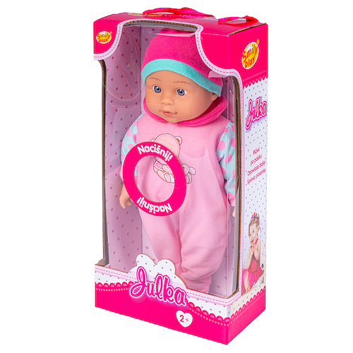 Lalka Julka lubi, kiedy się nią opiekujesz i zabierasz ze sobą na spacery. Miękka lalka jest ubrana w czapkę, kombinezon z różnych faktur materiałów.