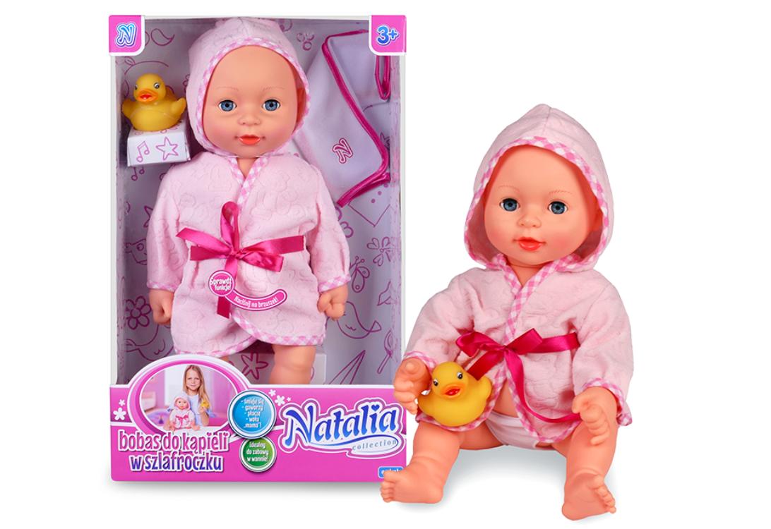 FUNKCJE: PO WŁĄCZENIU NA PLECACH I NACIŚNIĘCIU NA PĘPEK WYDAJE ODGŁOSY GAWORZENIA I PŁACZU, W ZESTAWIE: LALKA W SZLAFROKU 39 CM., KACZUSZKA, RĘCZNIK, ZASILANE: 2XAAA, WYM. OPK: 40X26X12 CM