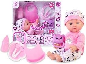 W zestawie: lalka miękka, butelka, śliniak, miseczka, sztućce, grzechotka,