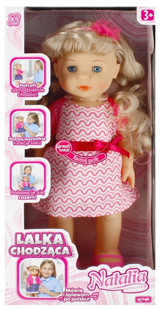 W zestawie: lalka miękka 40 cm., Funkcje: po klaśnięciu 2 x w dłonie lalka zacznie chodzić, po naciśnięciu na brzuszek śpiewa 3 piosenki, mówi 7 fraz, wym. Opko: 20 x 45 x 13 cm., Baterie: 3 x aaa 1,5v, zał. Demonstracyjne, 3+