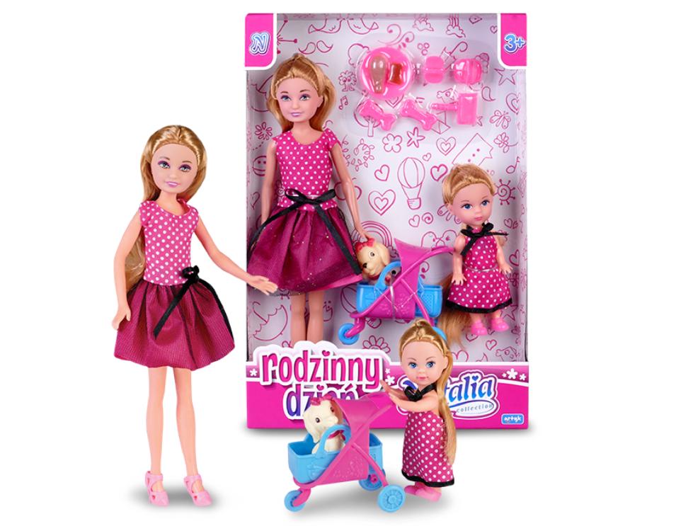 W ZESTAWIE: LALKA 16 CM., LALKA 8 CM, PIESEK, WÓZEK/NOSIDEŁKO, AKCESORIA, WYM. OPK: 27X18,5X5 CM