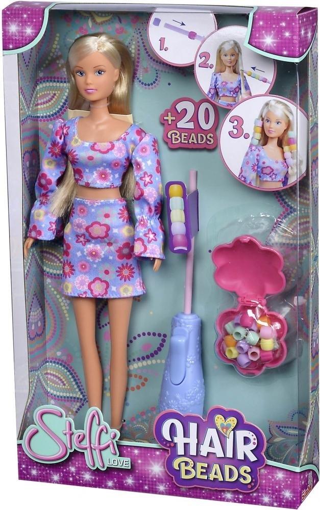Steffi w kwiecistym, dwuczęściowym kostiumie z przyrządem do nakładania koralików na włosy. W zestawie również kolorowe koraliki, gumeczki do mocowania na włosy i grzebień do czesania z funkcją przechowywania koralików, Wysokość 29 cm, Wiek:+3