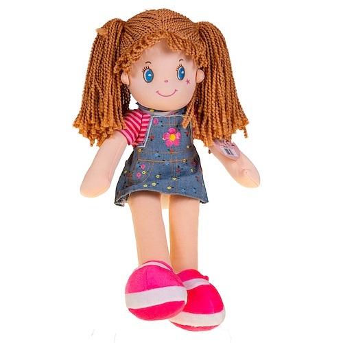 Lalka to blondynka uczesana w dwa kucyki, ubrana jest w T-shirt różowy w paski, dżinsową sukienkę w kwiatki i różowo-białe buciki.