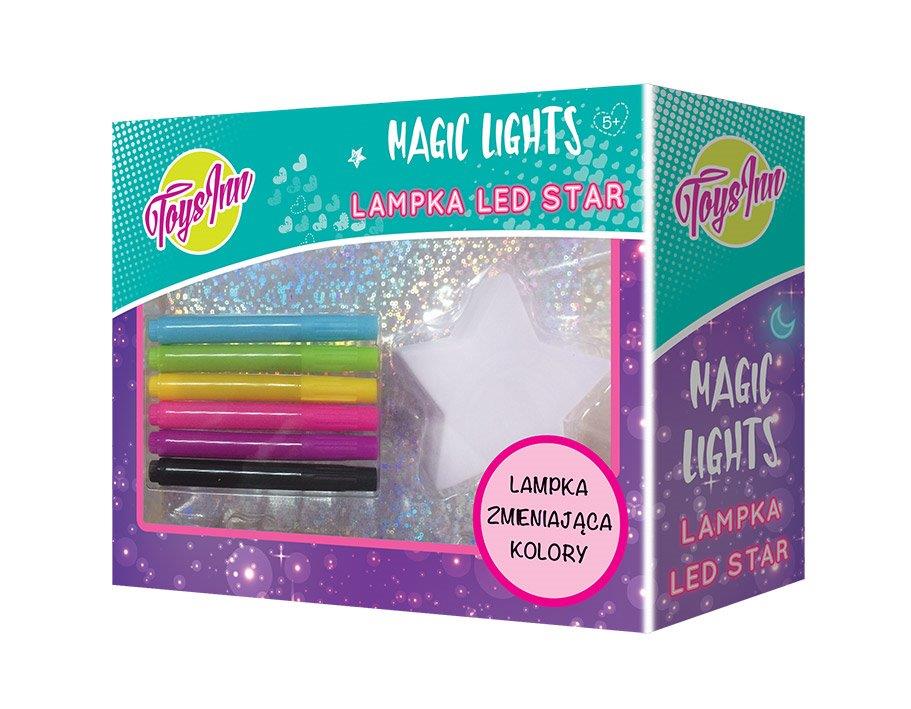 Zawartość – lampka LED w kształcie gwiazdki świecąca wieloma kolorami, 6 permanentnych markerów.
