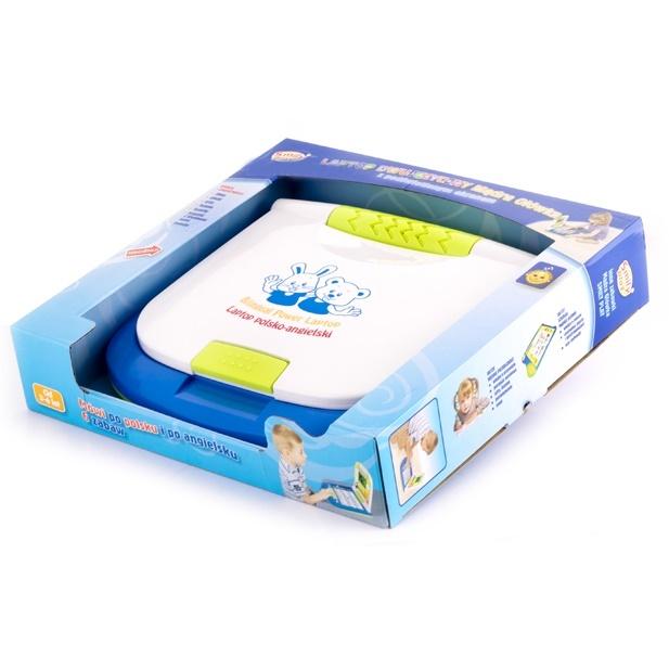 To edukacyjna zabawka, która mówi po polsku i po angielsku. Laptop jest interaktywną zabawką wspomagającą rozwój intelektualny malucha. Rekomendowana dla dzieci w wieku pomiędzy 3 a 6 rokiem życia. Laptop jest wyposażony w ekran LCD (8cm x 4cm) na którym wyświetlane są ciekawe animacje po naciśnięciu przycisków na klawiaturze. Wygląda zupełnie jak prawdziwy. Do wyboru 6 zabaw w dwóch językach. Posiada wyłącznik, regulator nateżenia dźwięku oraz przełącznik zmiany jezyka.