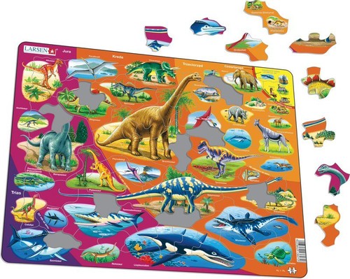 Patrz i ucz się! Dzięki tej historycznej ilustracyjnej układance, która przedstawia ewolucję dinozaurów od okresu triasu do czwartorzędu, możesz odkryć, jak wyglądały dinozaury ponad 200 milionów lat temu! Przedstawione są różne dinozaury, w tym mięsożerny Tyrannosaurus Rex i pływający Temnodontozaur. W każdym okresie zobaczysz ewolucję dinozaurów pływających, które żyły w podobnym środowisku. Należą do nich Plezjozaur, Temnodontozaur, Szonizaur, Notozaur, Lipleurodon i Mozazaur. W okresie jurajskim, kredowym, trzeciorzędowym i czwartorzędowym można znaleźć m. in. Triceratopsa, Spinozaura, Pterodaktyla, Phenacodusa, Uintatherium, Smilodona, Ankylozaura, Mamuta, czy wreszcie współczesne stworzenia - wilka, zebrę, człowieka... Układanka ma żywe kolory. Składa się z 85 niewielkich elementów i przeznaczona jest dla starszych dzieci.