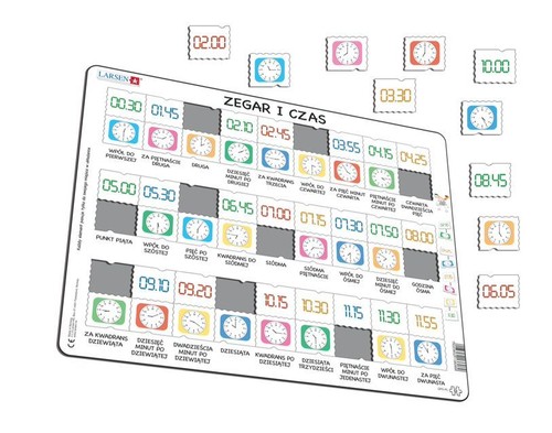 Naucz się odczytywać i opisywać czas dzięki tej układance ""Zegar i czas"". Ta układanka składa się z trzech rzędów dwuelementowych sekcji. Górny rząd sekcji pokazuje czas w formacie cyfrowym, podczas gdy rząd dolny pokazuje zegar analogowy. Pod tymi elementami, na ramce, znajduje się czas opisany słownie. Ta układanka memo zachęca gracza do zapamiętywania właściwych miejsc, aby utrwalać, jak określić czas. Elementy układanki są wykonane z unikalnie zakrzywionymi krawędziami, aby pasowały tylko i wyłącznie do prawidłowego opisu czasu na ramce. Układanka zawiera 54 elementy i przeznaczona jest dla małych dzieci uczących się odczytywać czas z zegara.