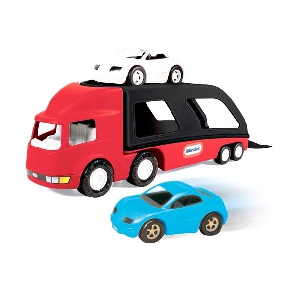 Duża, nowoczesna plastikowa ciężarówka z odłączoną naczepą - lawetą i dwoma samochodzikami.