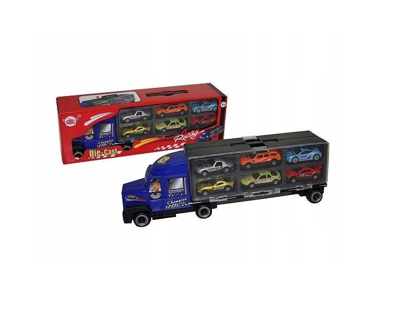 Metalowa laweta na 6 samochodzików. Zestaw zawiera samochodziki.