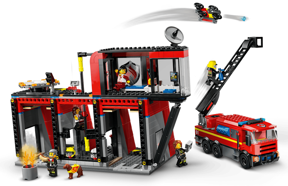 Zabawa z pełnym różnych funkcji zestawem z remizą strażacką i wozem strażackim rozpali emocje dzieci.
