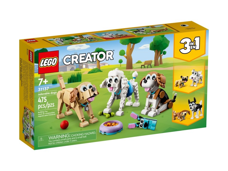 Miłośnicy psów i dzieci w wieku od siedmiu lat mogą bawić się uroczymi pieskami z zestawu LEGO(R) Creator 3 w 1 Urocze psiaki (31137). Zawiera on beagle'a, pudla i labradora z ruchomymi głowami, ogonkami i uszami, a także akcesoria, w tym miskę, szczotkę, zabawkowego królika, piłkę i smycz, aby urozmaicić wymyślane przez dzieci historie.