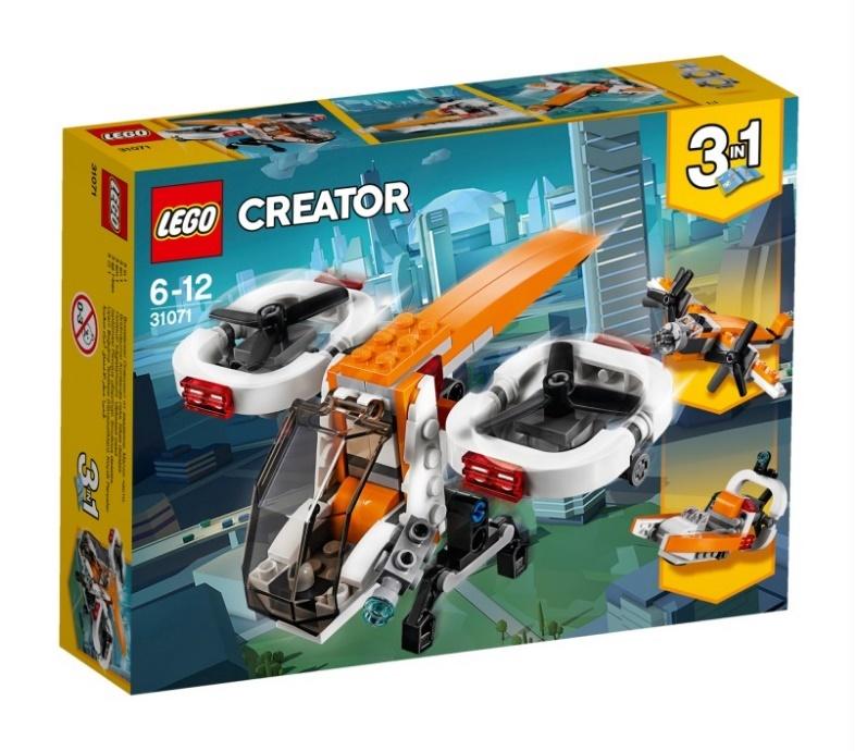 Wznieś się w powietrze w rewelacyjnym Dronie badawczym 3 w 1 z pomarańczowych, białych i czarnych klocków.