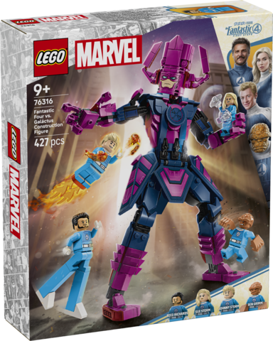 Ta zabawka dla 9-latka do zbudowania zawiera cztery minifigurki LEGO Fantastycznej Czwórki, w tym Pana Fantastica z rozciągliwymi nogami, Ludzką Pochodnię z dwoma miotaczami płomieni i przezroczystą podpórką imitującą latanie, Niewidzialną Kobietę z polami siłowymi oraz Stwora z potężnymi dłońmi. W pełni ruchoma figurka Galactusa o wysokości 28 cm pozwala na niekończące się pojedynki między superbohaterami a złoczyńcą.