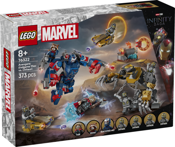 LEGO(R) ǀ Marvel Avengers: Koniec gry Thor kontra Chitauri (76322) to wysokiej jakości zabawka z superbohaterami. Ten wszechstronny zestaw będzie świetnym prezentem dla dzieci w wieku od ośmiu lat, które lubią filmy Marvela, mechy, bohaterów i film Avengers: Koniec gry Wzorowany na kultowej scenie bitwy z Avengersami Marvela zestaw zawiera dwie duże figurki LEGO: mecha Iron Patriota, który zawiera cztery miotacze klocków, i straszliwego goryla Chitauri. Obie są ruchome, co umożliwia dynamiczną zabawę. W zestawie jest też siedem minifigurek: Iron Patriot MK2, Rocket z dużym miotaczem klocków, Thor ze Stormbreakerem i czterech Chitauri (dwóch ma złote miotacze klocków). Inne funkcje obejmują dwa skutery odrzutowe i małą przestrzeń dla Thora, w której można przechowywać zapasowe elementy do miotacza. Ten zestaw można połączyć z zestawem Avengers: Koniec gry -- ostateczna bitwa (76323), co zapewnia dodatkowe możliwości zabawy. Konstruktorzy mogą również powiększać i obracać modele w 3D za pomocą fajnej, intuicyjnej aplikacji LEGO Builder. Zestaw zawiera 373 elementy.
