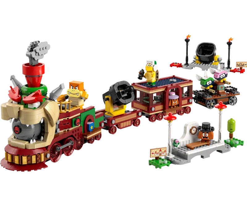 Pociąg ekspresowy Bowsera z dwiema stacjami kolejowymi i drezyną