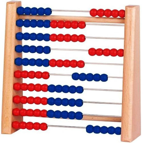 Liczydło drewniane z metalowymi prętami. 100 kulek w dwóch kolorach: czerwony i niebieski.