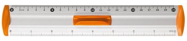 Linijka wykonana z aluminium ze skalą po dwóch stronach. Posiada wygodny uchwyt na ołówek. Długość linijki 20 cm. Kolor pomarańczowy.