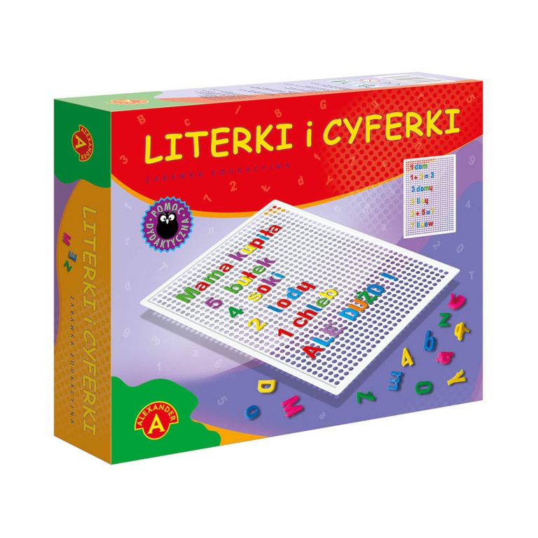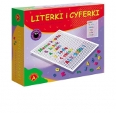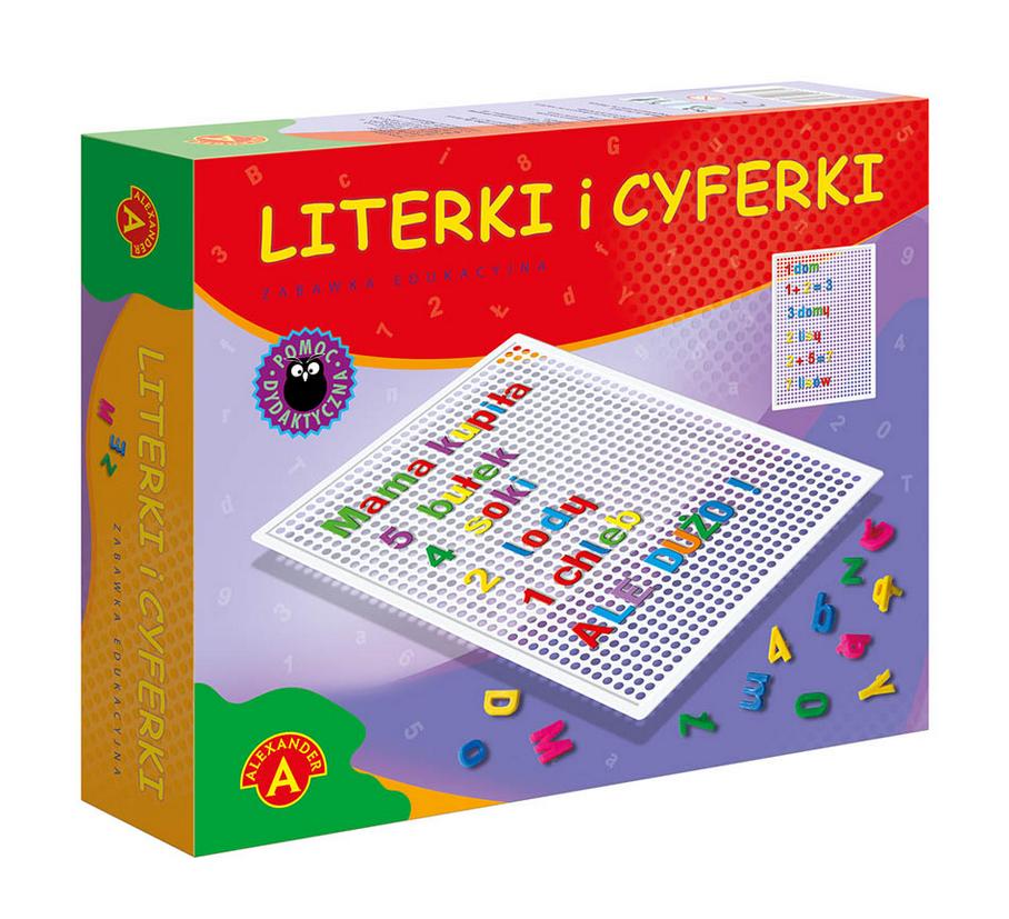 ,,Literki i cyferki w pudełku"" to zabawka i znakomita pomoc dydaktyczna dla dzieci, które zaczynają naukę i czytania i liczenia. Zabawka składa się z perforowanej tablicy, zbioru dużych i małych literek oraz z zestawu cyferek. Literki i cyferki można wpinać w otwory tablicy, układając w ten sposób wyrazy, zdania i proste działania matematyczne. Zabawka pozwala również ćwiczyć cierpliwość i zręczność manualną. Kolor elementów wewnątrz opakowania może różnić się od ich kolorystyki na opakowaniu.