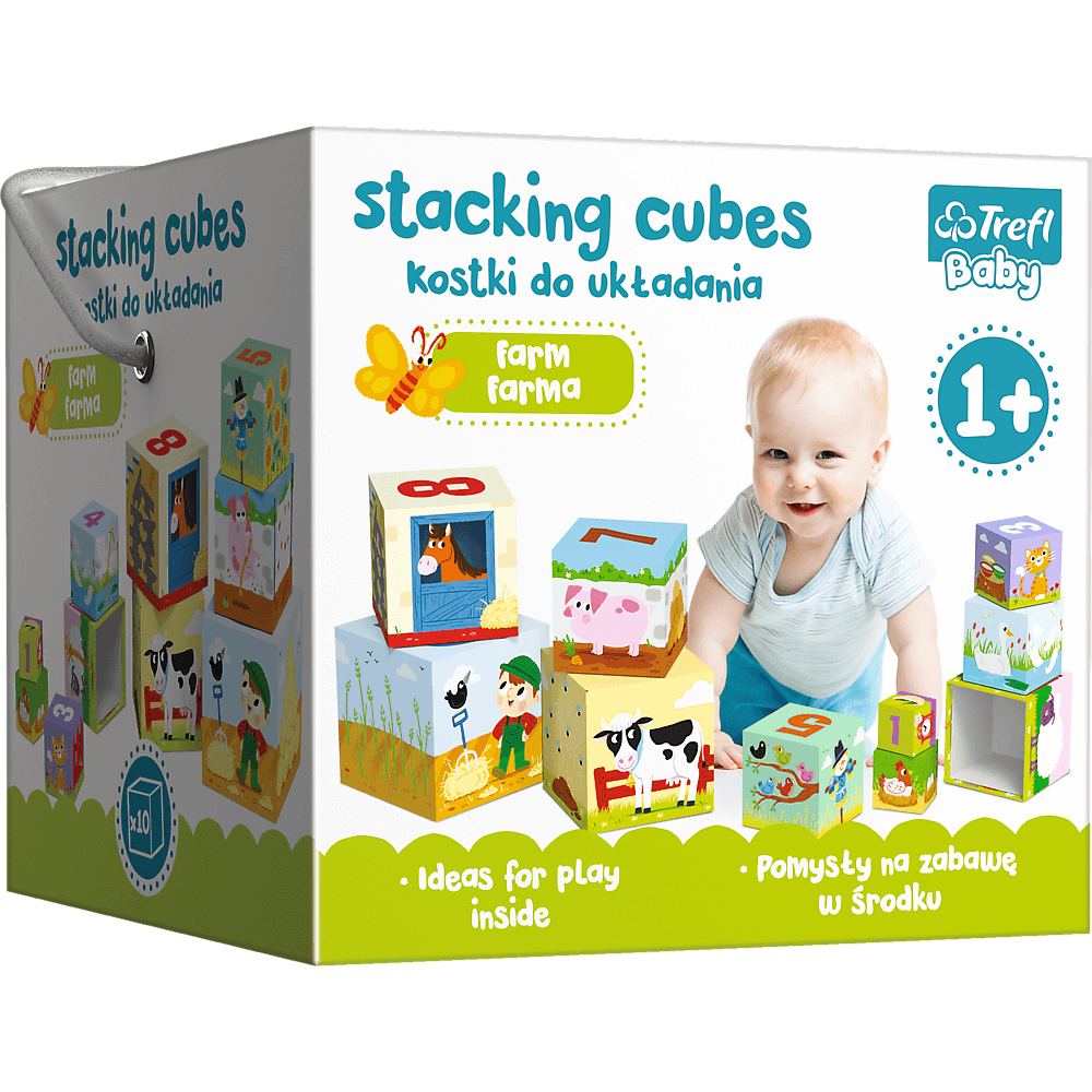 Zestaw 10 kolorowych kostek różnej wielkości, które można układać w dużą wieżę lub inny, dowolny sposób. Dzięki wyjątkowym ilustracjom maluchy poznają życie na farmie oraz liczby od 1 do 10.
