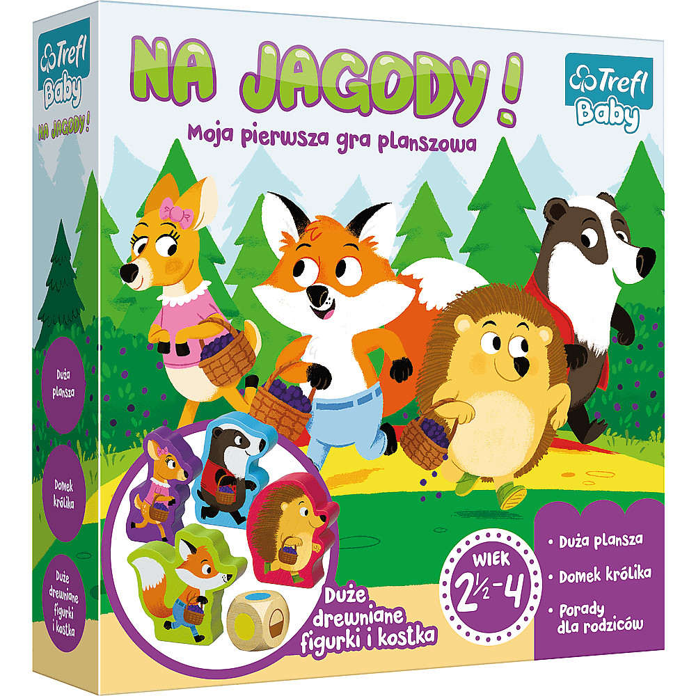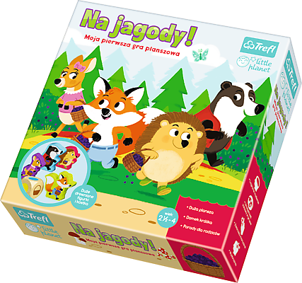 Na jagody! Pierwsza gra planszowa dla maluchów, ich przyjaciół oraz rodziców. Mieszkańcy lasu wrócili właśnie z jagodobrania. Ten, który jako pierwszy dotrze do chatki królika z koszykiem pełnym jagód - zwycięża. W nagrodę, na zwycięzcę czeka świeżo upieczone ciasto jagodowe, zaś pozostali uczestnicy gry otrzymują pyszne nagrody pocieszenia!