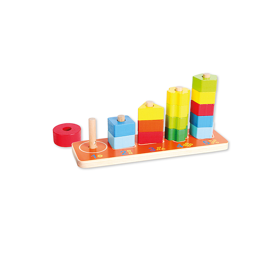 Układanka uczy rozróżniania kształtów, kolorów, sortowania i rozróżniania pojęcia większy – mniejszy. Składa się z 15 geometrycznych drewnianych klocków. Dziecko może je układać na podstawie zgodnie z cyframi umieszczonymi przy każdej wieży lub sortując klocki według kształtów.