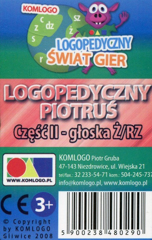 Zasady gry:1. ""Logopedyczny Piotruś"" - jest to prosta gra w karty przeznaczona już dla dzieci w wieku od 3-4 lat. Może w niej uczestniczyć od 2 do 5 graczy. Do gry należy wykorzystać 25 kart (12 par oraz jednego Piotrusia). Przed przystąpieniem do gry karty należy potasować a następnie rozdać kolejno wszystkim graczom. Można rozdać wszystkie karty, bądź tylko niektóre (w zależności od możliwości i wieku dziecka). Z otrzymanych kart uczestnicy wybierają i odkładają wszystkie pary. Pozostałe karty uczestnicy gry układają w ""wachlarz"". Następnie każdy gracz wyciąga jedną karę od osoby siedzącej po prawej stronie. Jeśli dobrana karta pasuje do pary z inną posiadaną - całą parę, tak jak w poprzedniej fazie, gracz odkłada na bok. Czynności te wykonują kolejno wszyscy gracze. Dziecko, które pierwsze pozbędzie się wszystkich kart wygrywa, natomiast dziecko, które pozostanie z Piotrusiem przegrywa.2. ""Memory"" - gra zalecana jest dla dzieci już od 3 roku życia. Może w niej uczestniczyć od 2 do 5 osób. Do gry należy wykorzystać wszystkie 13 par kart. Można też w zależności od wieku i możliwości dzieci wykorzystać mniejszą ilość par. Karty układa się obrazkami do dołu. Karty można ułożyć w rzędach, bądź luźno poukładać na stole. Następnie każdy z graczy (zgodnie z ruchem wskazówek zegara) odsłania po 2 karty i głośno wymawia ich nazwę. Dziecko, które odkryje dwa takie same obrazki zabiera parę ze stołu. Wygrywa ta osoba, która na po odkryciu wszystkich kart będzie miała najwięcej zebranych par.