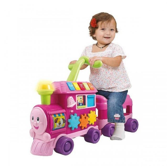 Po odłączeniu wagonika zabawka zamienia się w muzyczny chodzik, wyposażony w uchwyt do pchania.
