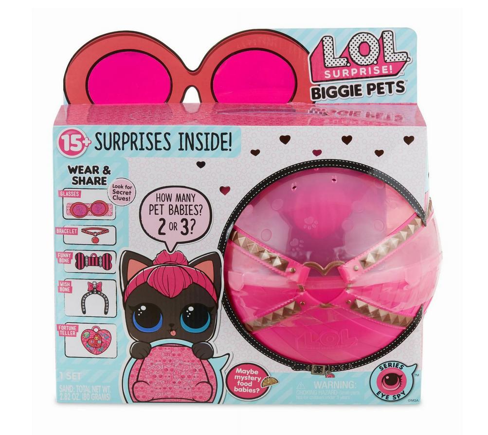 L.O.L. Surprise Biggie Pet z ponad 15 niespodziankami w środku. Zestaw 1-go zwierzaka oraz 2-ch malutkich zwierzątek oraz zestawu akcesoriów lub jedzenia dla nich. Korzystaj z akcesoriów: okulary szpiegowskie, a jej naszyjnik staje się dla ciebie bransoletką 1 zabawna kość, 1 śmieszna kość, 1 serce wróżby, 1 karta ujawnienia. Futerał może być noszony jako plecak i podwaja się jako skarbonka. Kula-opakowanie/torebka. Plakat kolekcjonerski.