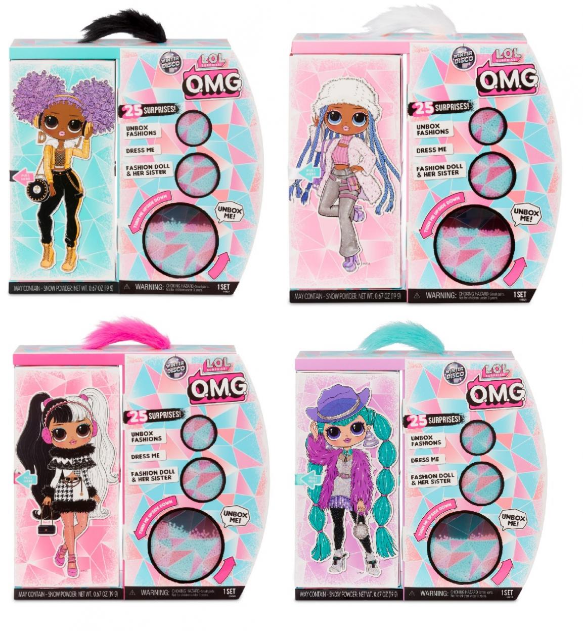 Otwórz ponad 25 niespodzianek! Lalki L.O.L. Surprise OMG z serii Winter Disco z mniejszymi siostrami! Zbierz wszystkie lalki OMG! Karton może służyć jako garderoba i przebieralnia. W zestawie stojak na lalkę i inne akcesoria modowe.