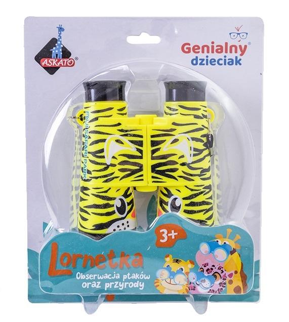 Lornetka posiada wygodną regulację rozstawu okularów, jest dopasowana do wielkości dziecięcej dłoni oraz posiada atrakcyjne wzornictwo nawiązujące do dzikiej przyrody i egzotycznych zwierząt.