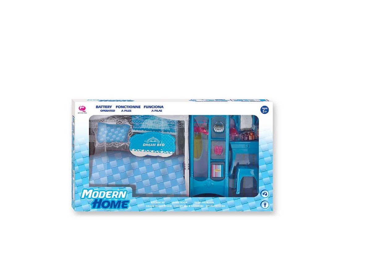Zestaw sypialniany w kolorze niebieskim, idealny do zabawy z lalkami.