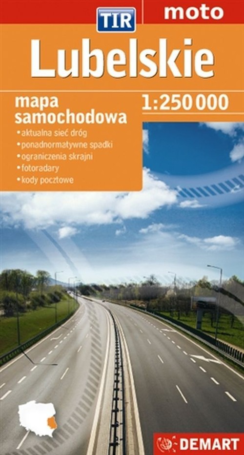 Mapa przeznaczona jest nie tylko dla kierowców zawodowych (TIR-ów, ciężarówek,) ale i dla wszystkich innych kierowców, którzy dużo jeżdżą po Polsce.   Ma rozbudowaną treść tematyczną przydatną kierowcom:  - aktualną sieć dróg  - ponadnormatywne spadki z opisem stopnia nachylenia,  - pionowe i poziome ograniczenia skrajni,  - polecane parkingi (TIR, prysznic, gastronomia),  - prawdopodobne lokalizacje fotoradarów,  - spis kodów pocztowych,   Przedstawiona sieć dróg uwzględnia budowane odcinki: autostrad, dróg krajowych i wojewódzkich przewidzianych do użytku do końca 2013 roku.     Skala: 1:250 000