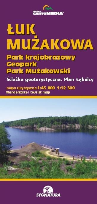 Mapa turystyczna ""Łuk Mużakowa- Park krajobrazowy. Geopark. Park Mużakowski"" w skali 1:45 000. Na rewersie mapy znajduje się plan Łęknicy w skali 1:12 500 oraz krótki opis prezentowanego obszaru z wieloma fotografiami.