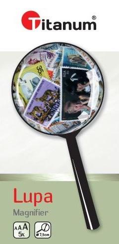 o lupa w plastikowej oprawie o średnica 7,5 cm o powiększa 5x
