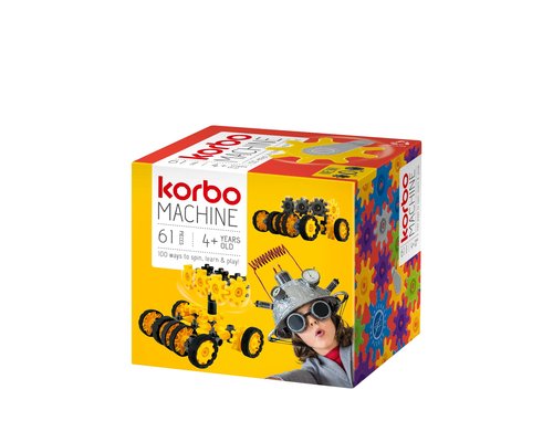 Korbo klocki MACHINE 61 el. Żółto-szare klocki konstrukcyjne pozwalają na zbudowanie fantastycznego pojazdu, wyposażonego w opony na kołach zębatych. Dzięki nim i specjalnym korbkom, mały budowniczy może wprawić swoją konstrukcję w ruch.
