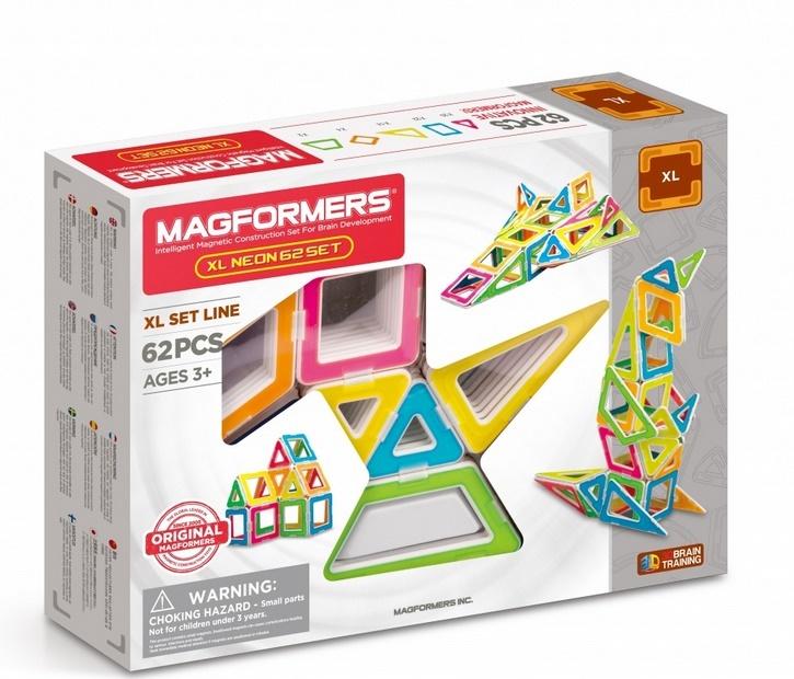 MAGFORMERS NEON to klocki z wbudowanymi silnymi magnesami neodymowymi o neonowych kolorach, które zawsze się przyciągają. Wystarczy zbliżyć do siebie ściankami dwa klocki, a one natychmiast ze sobą się połączą. Za pomocą klocków wzorowanych na kształt figur geometrycznych można zbudować wspaniałe trójwymiarowe budowle. W zabawie można korzystać z dołączonej do zestawu instrukcji lub innych przykładów zamieszczonych na stronie magformersworld.com lub własnej wyobraźni. Zestaw składa się z 20 trójkątów 22 kwadratów 4 wysokich trójkątów, 4 rombów i 2 trapezów.