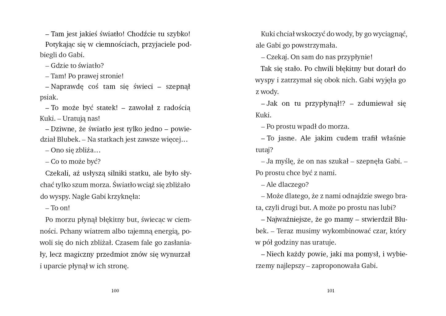 Kuki, Gabi i Blubek chcą ocalić swoją szkołę, która ma być zburzona. Znajdują magiczny przedmiot. Jednak by użyć jego mocy, muszą zdobyć zaginioną część. Walczą z olbrzymim Łowcą i oszustami sprzedającymi znikające zabawki. Uciekają z dziwnej wyspy i tworzą niesamowity statek. Lecz gdy czar zmienia ich w kamienie, uratować ich może tylko mówiący pies