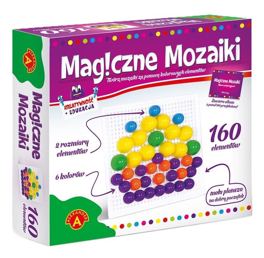 Magiczne Mozaiki"" to kreatywna zabawa dla dzieci, młodzieży i dorosłych.Do Waszej dyspozycji oddana zostaje plansza z mnóstwem otworów, w których należy umieścić różnej wielkości kolorowe elementy, by stworzyć rozmaite wzory i obrazy. Istnieje niemal nieskończona ilość kombinacji, a po wykonaniu ilustracji wystarczy,że wyjmiecie elementy i możecie zacząć od nowa.Do zestawu dołączony jest album zawierający ponad 100 inspiracji, Zabawa ćwiczy kreatywność i wyobraźnię.Zestaw zawiera 160 kołeczków o śr. 23 mm- 140 szt, 30 mm - 20 szt.