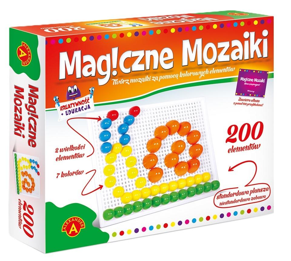 Magiczne Mozaiki"" to kreatywna zabawa dla dzieci, młodzieży i dorosłych.Do Waszej dyspozycjioddana zostaje plansza z mnóswem otworów, w których należyumieścić różnej wielkościkolorowe elementy, by stworzyć rozmaite wzoryi obrazy. Istnieje niemal nieskończona ilośćkombinacji, a po wykonaniu ilustracjiwystarczy,że wyjmiecie elementyi możecie zacząć od nowa.Do zsetawu dołączony jest album zawierający ponad 100 inspiracji, Zabawa ćwiczy kreatywność i wyobraźnię.Zestaw zawiera 200 kołeczków o śr. 23 mm-140 szt, 30mm- 60 szt.