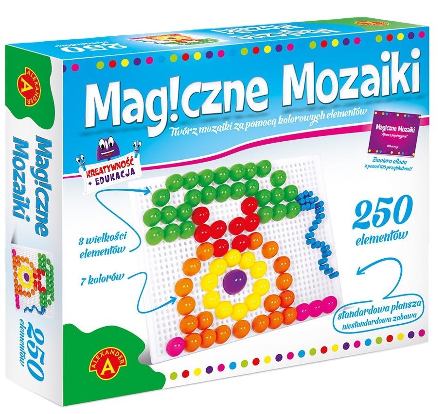 Magiczne Mozaiki"" to kreatywna zabawa dla dzieci, młodzieży i dorosłych.Do Waszej dyspozycji oddana zostaje plansza z mnóstwem otworów, w których należy umieścić różnej wielkości kolorowe elementy, by stworzyć rozmaite wzory i obrazy. Istnieje niemal nieskończona ilość kombinacji, a po wykonaniu ilustracji wystarczy,że wyjmiecie elementy i możecie zacząć od nowa.Do zestawu dołączony jest album zawierający ponad 100 inspiracji, Zabawa ćwiczy kreatywność i wyobraźnię.Zestaw zawiera 250 kołeczków o śr. 15 mm - 42 szt, 23 mm- 148 szt, 30 mm - 60 szt.