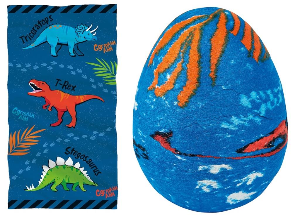 Trzy dinozaury z jajka? To działa! W każdym razie z magicznym ręcznikiem Dino-jajko! Jeśli zmoczysz jajko lub umieścisz je w wodzie, Triceratops, T-Rex i Stegosaurus dorastają - jako supercoolowy motyw dino na kolorowym ręczniku. Idealny prezent lub jako pamiątka dla małych fanów dino.