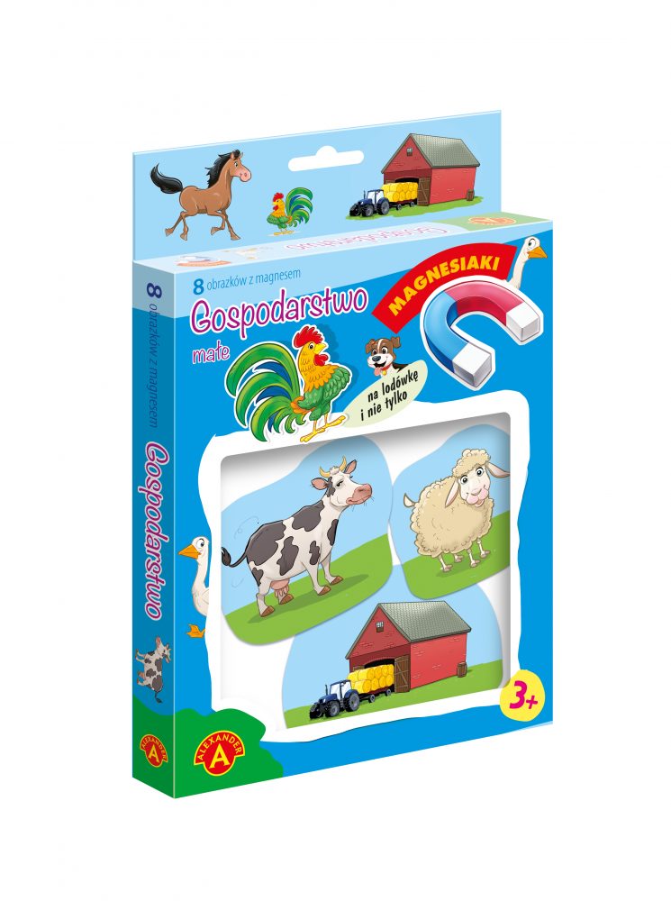 Magnesiaki Małe Gospodarstwo to zestaw tematycznych obrazków, powleczonych magnetyczną folią na odwrocie. Dzięki temu obrazki można układać nie tylko na stole lub podłodze, można je również ustawiać na pionowej ścianie lodówki lub innych metalowych płaszczyznach. Serię wyróżnia przede wszystkim bardzo ładna grafika, duże rozmiary, oraz gruba tektura, pozwalająca dzieciom na łatwy chwyt. Strona z obrazkiem powleczona została folią, aby łatwo było je czyścić