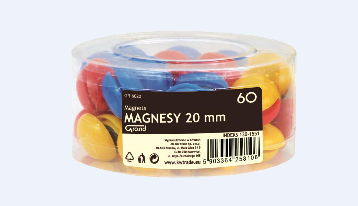 Kolorowe magnesy w plastikowej obudowie. Średnica 20 mm, opak. 60 szt. w plastikowej tubie.