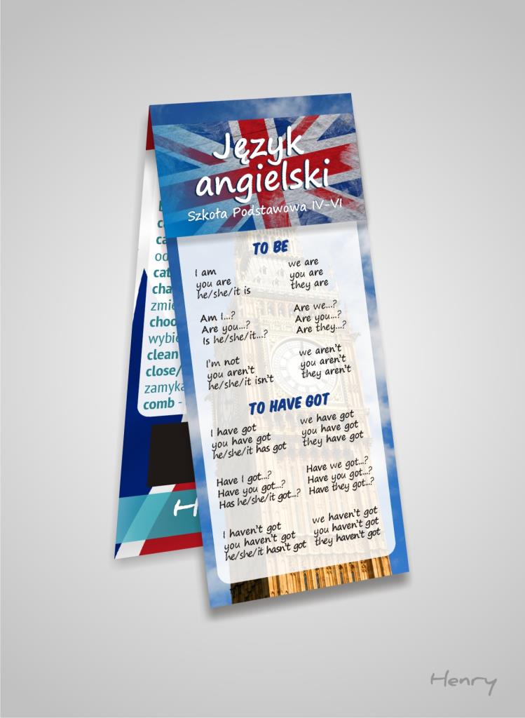 Zakładka z zapięciem magnetycznycm. Zakres wiedzy: szkoła podstawowa klasy lV - Vl. Odmiany, zaimki, czasowniki . Format złożonej 80x190 mm, format całości 80x380 mm, uszlachetnienie folią błyszczącą, opkaowanie foliowe z euro zawieszką.
