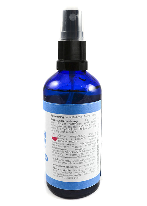 Mineralizator magnezowy do ciała. Wysokoskoncentrowany olejek zawierający aktywny magnez. Stosowany w kosmetyce, masażach, przy intensywnym uprawianiu sportu oraz do szybkiej suplementacji magnezu. Produkt pochodzenia naturalnego.