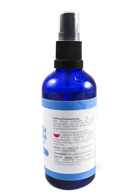 Mineralizator magnezowy do ciała. Wysokoskoncentrowany olejek zawierający aktywny magnez. Stosowany w kosmetyce, masażach, przy intensywnym uprawianiu sportu oraz do szybkiej suplementacji magnezu. Produkt pochodzenia naturalnego.