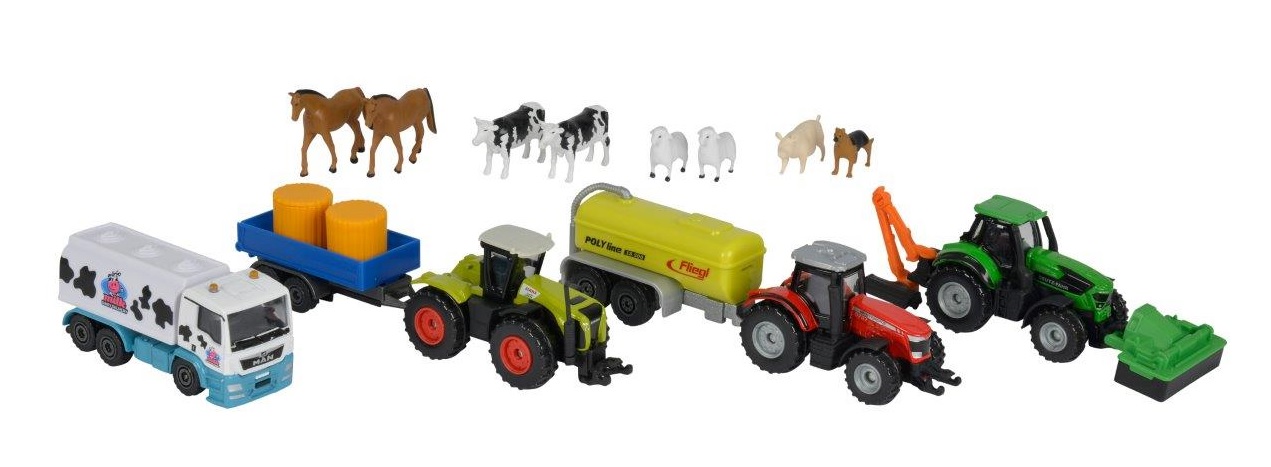 Majorette Zestaw farmerski, w skład zestawu wchodzą: 2 ciągniki, 2 przyczepy, mlekowóz, pojazd farmerski, 2 bele słomy, 8 zwierząt